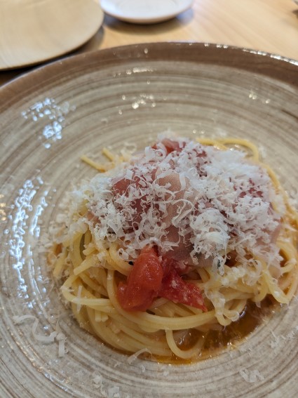 フレッシュトマトとバジリコのアーリオオーリオと生ハム