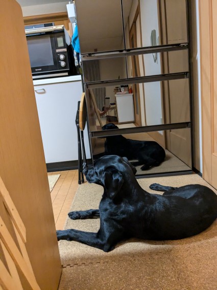 キッチンのドアからシャーが入ってこないか見ている様子。