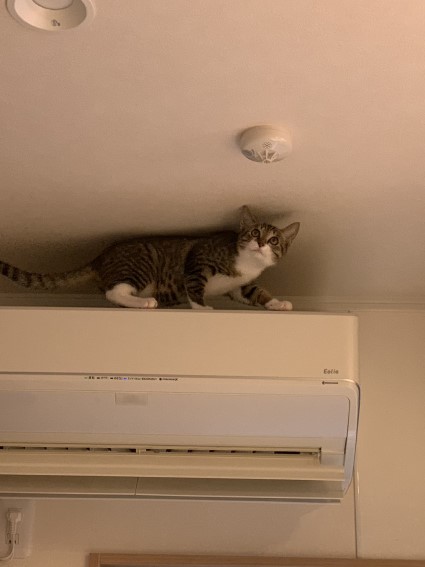 カーテンレールからとうとう一番高いエアコンの上まで到達だそうだ。