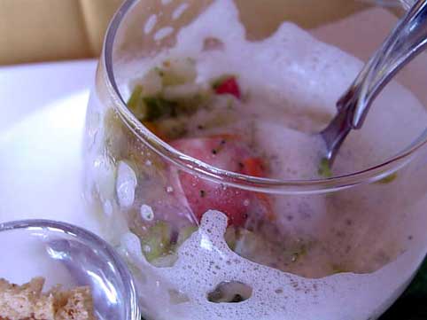 ふわふわとしたバルサミコ酢の泡の中に色んな夏野菜が入ってて