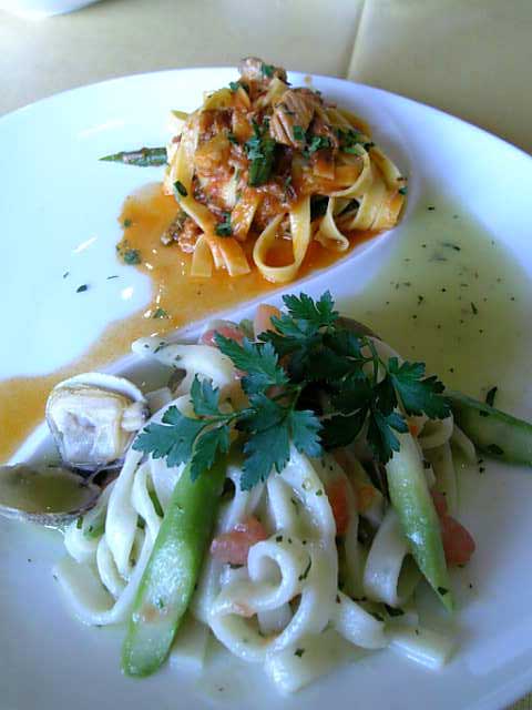 夫とそれぞれに選んだパスタは、1つのお皿に2種類取り分けて運んでくれる。