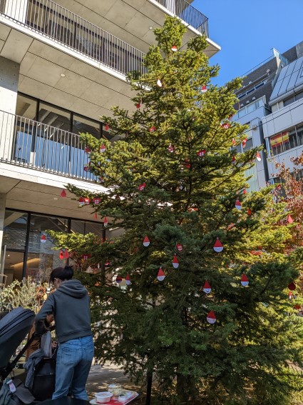 アンデルセンに行くと、外のツリーにはサンタクロースがいっぱい。