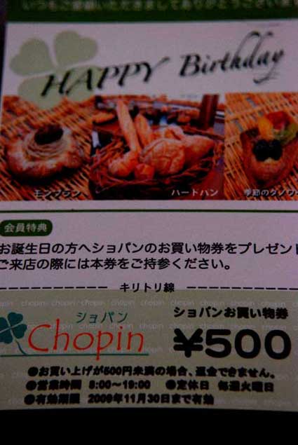 私の大好きなパン屋さん、「ショパン」から誕生日プレゼントのお買い物券が届いた。