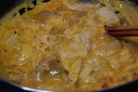 薄く切って焼いておいたところへくんちゃん卵をどばどばっと入れ、