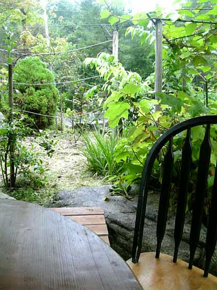雨がザ~~~っと降ってきたので、庭に用意してあるテーブルに避難