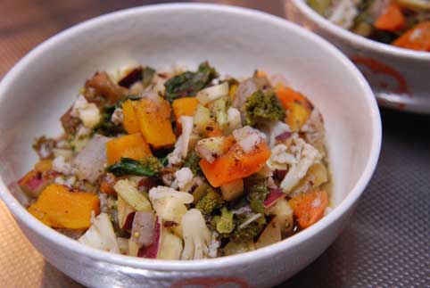 蒸した大根、ニンジン、カリフラワー、ブロッコリー、かぼちゃ、さつまいも、これに生のシカ肉です。