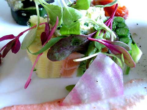 ヤングコーンやブロッコリーと一緒にサーモンが綺麗に並べてあって
