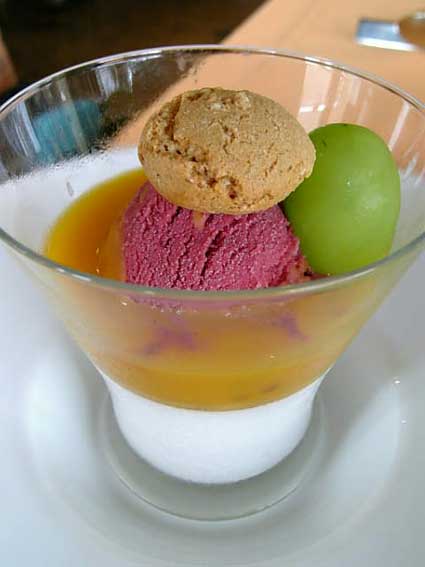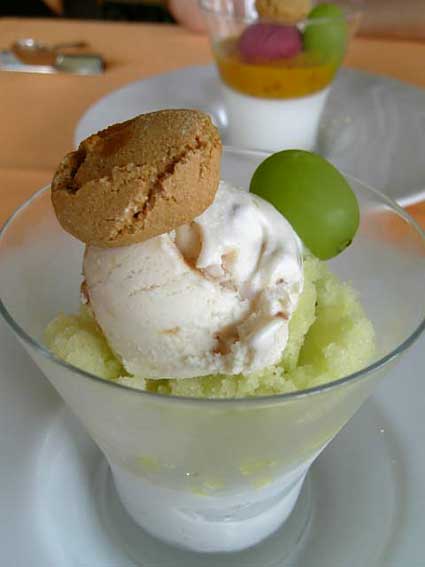 パンナコッタの上にメロンのシャーベット、そしてナッツのアイスクリーム