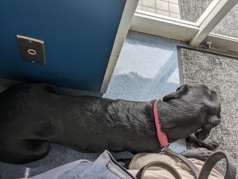 入口の柱と椅子の間の細い空間に良い子にしてフセているわさび。