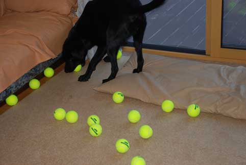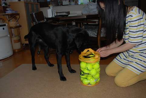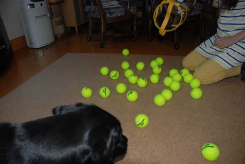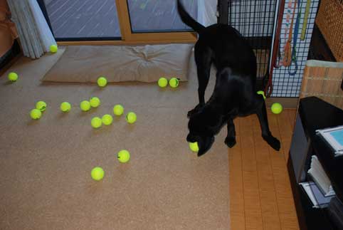あまりにもボールがありすぎて、どれをくわえていいのかわからない様子。