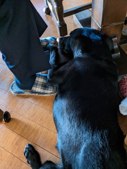 テーブルの下に寝そべっているわさびを邪魔しながら座る。