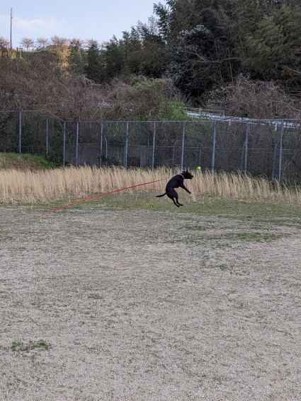口でキャッチする前に頭突きしてから咥える荒技を披露するわさび。