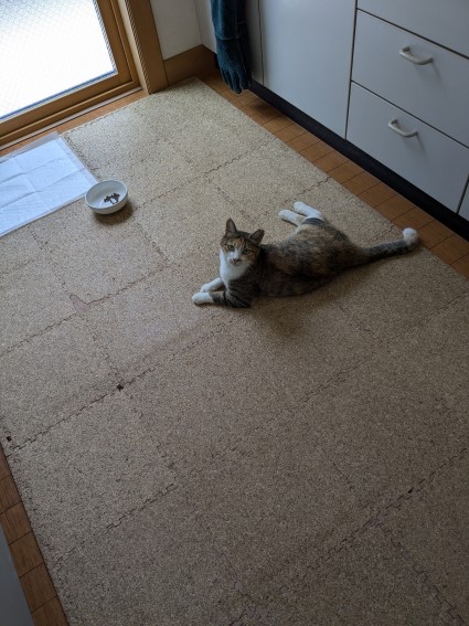 しばらくくつろいだ後は、ドアの前に立ってニャーと鳴く。