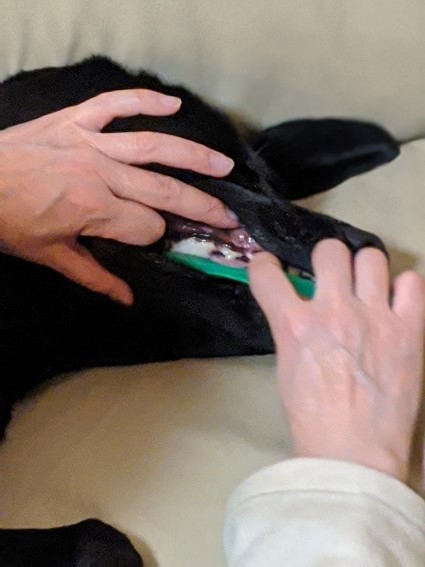 病院で買った犬用の歯磨き剤をブラシに付けて優しくごしごし