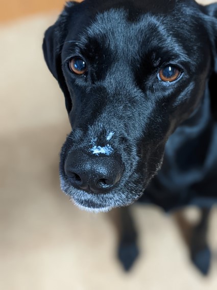 ヨーグルトのカップに鼻を突っ込んでなめた証拠(笑)