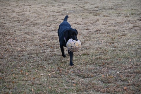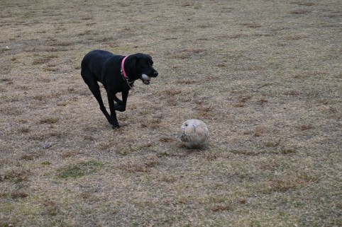 自分で倉庫からサッカーボールをくわえてきて遊ぶわさび。