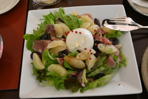 野菜とグレープフルーツに生ハム、真ん中にブッラータチーズを乗せて