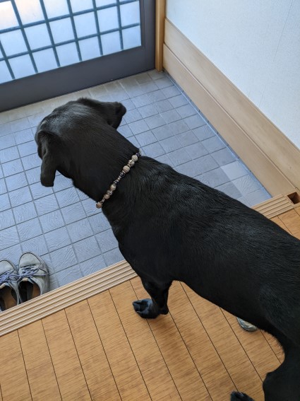 こうやって玄関で置いてけぼりをくわないように見張っている(笑)