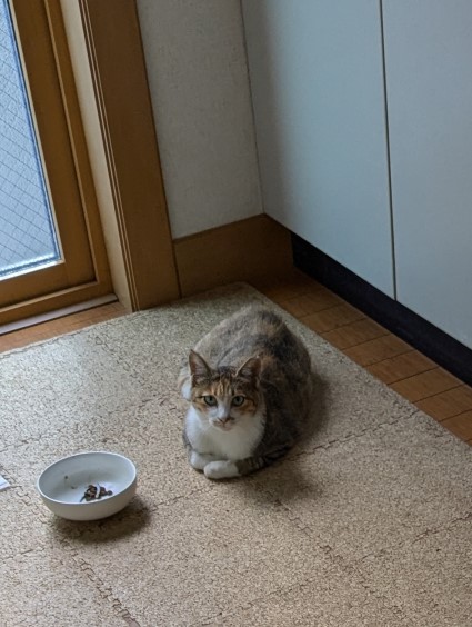 勝手口のドアの前に座って、ニャーと小さな声で鳴きだすと