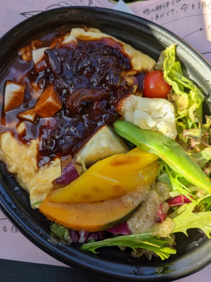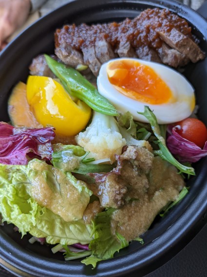 夫は和牛モモのステーキ弁当、私はデミのオムライス