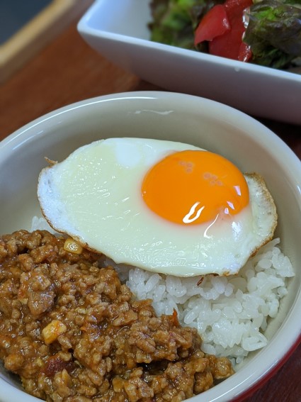 器にご飯を盛ったら、横にキーマカレー、ご飯の上に目玉焼き