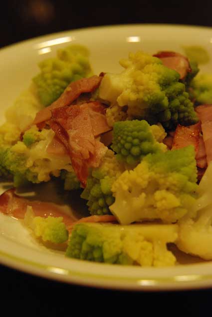 今回、ロマネスコをゆでてカリカリに焼いたハムと合わせる。