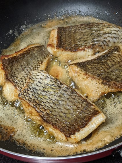 焦がしバターをたっぷり使って鯛のムニエルを作る。