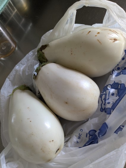 たくさんできたからと大きな白ナスをいただいた。