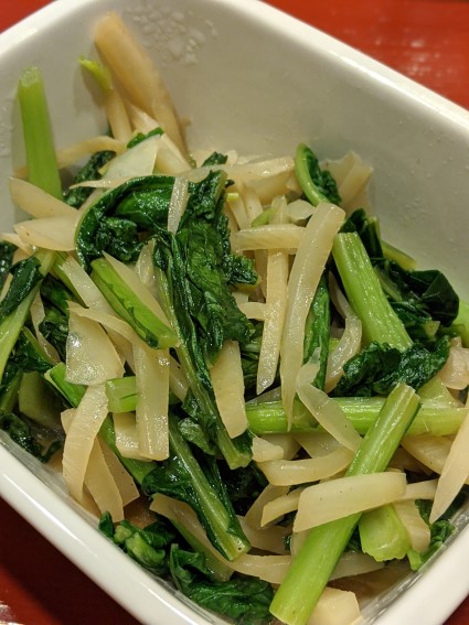 葉とともにバターで炒めて塩とコショウで味をつける。