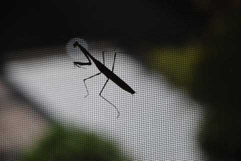 窓を見ると立派なカマキリが1匹、網戸にへばりついている。