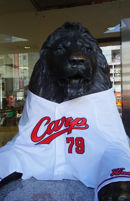 三越のライオンもカープの服を着て応援している。