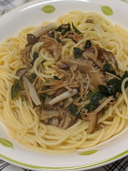 前はナポリタンだったけど、今度はきのことほうれん草。