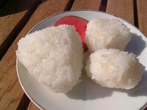 小さな方のおにぎりは無農薬有機栽培で作られた広島生まれのあきろまんという品種