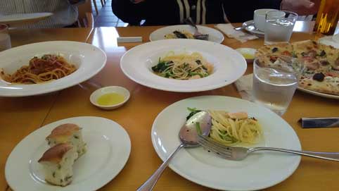 パスタを3種類、ピザを2種類注文して、みんなでワイワイ食べる。