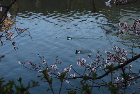 桜の花の先にはカモが2羽、チョコチョコと忙しなくもぐったり浮かんだり。