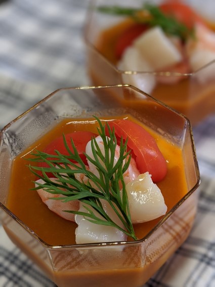 中に香ばしく焼いたホタテと長いも、エビを入れて固めたもの。