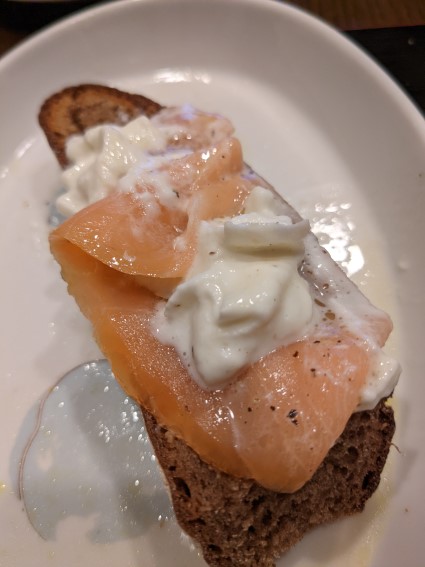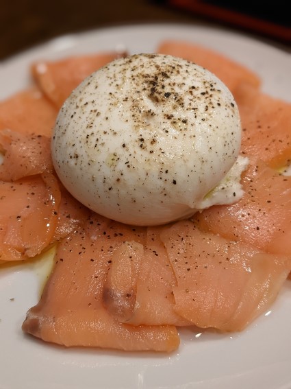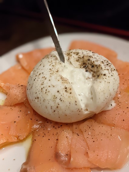 スモークサーモンにブッラータチーズを乗せただけのもの。