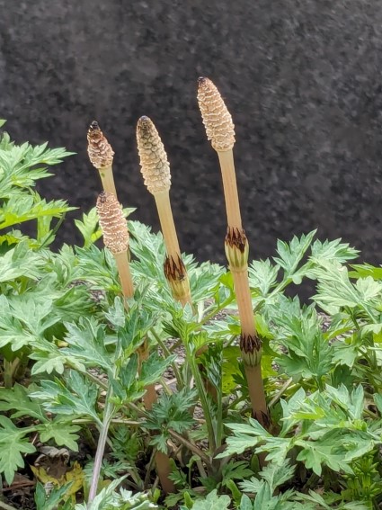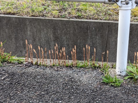アスファルトが切れたところにずら~~っと一列に並んでさいているツクシ