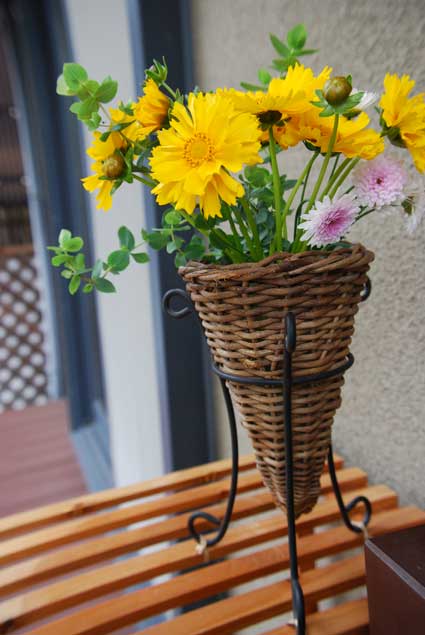 庭にあるオレガノやアイビー、ピンクマーガレットもいれるとステキになった。