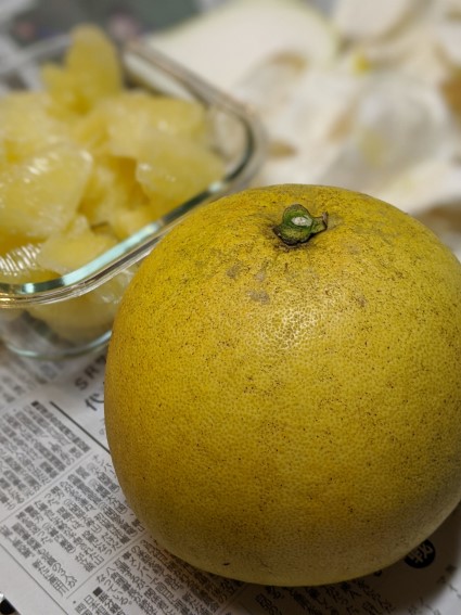 白くなる風景を眺めながら、キッチンで貰ったブンタンを剥く。