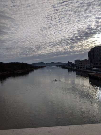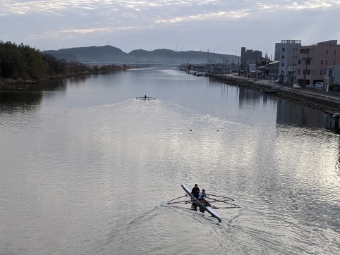 橋を歩いているとボート部の生徒が練習をしている。