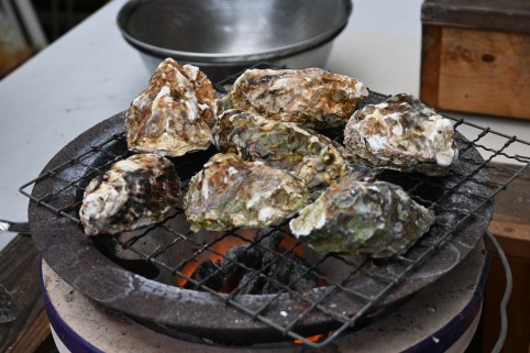 焼きたての牡蠣を軍手をはめた左手で持ち、