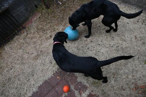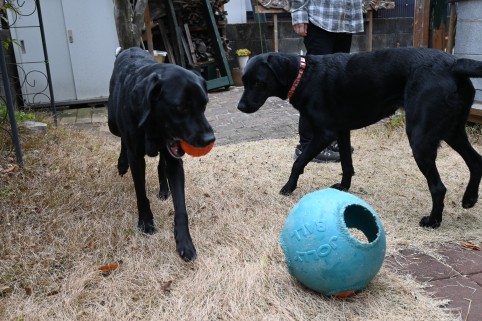 たすちゃんとわさびはボールに夢中で庭を走り回っている。