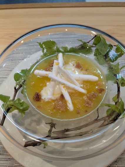 アスパラガスとエンドウ豆、汲み上げ湯葉、コンソメ、鱒の卵の一皿