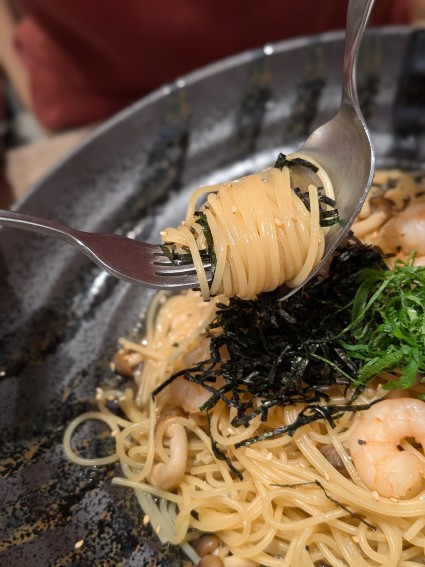 夫はきのことエビの醤油パスタで、サラダとドリンク付きをたのんだ。