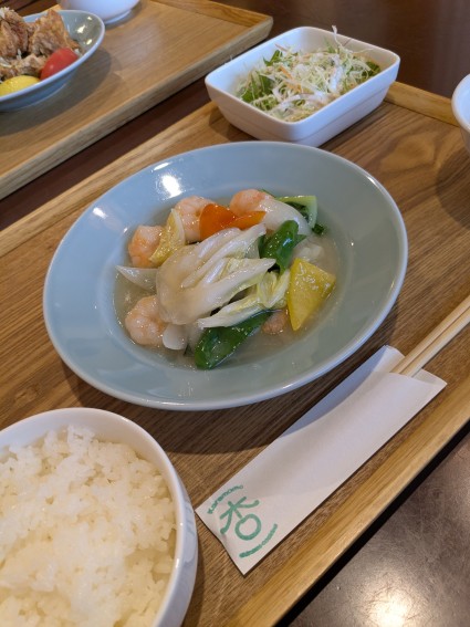 杏の今日のランチセットはエビの塩炒めと鶏唐揚げ油淋鶏
