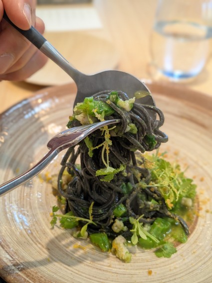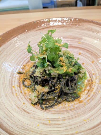 ヤリイカと菜の花、甘夏、カラスミを使ったイカスミのパスタ