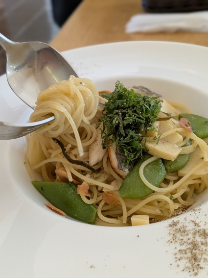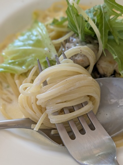 パスタがすっごくアツアツで口いっぱいに食べたいけど食べれない(笑)