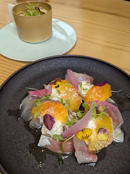 鯵のカルパッチョ タロッコオレンジ、ストラチャテッラ