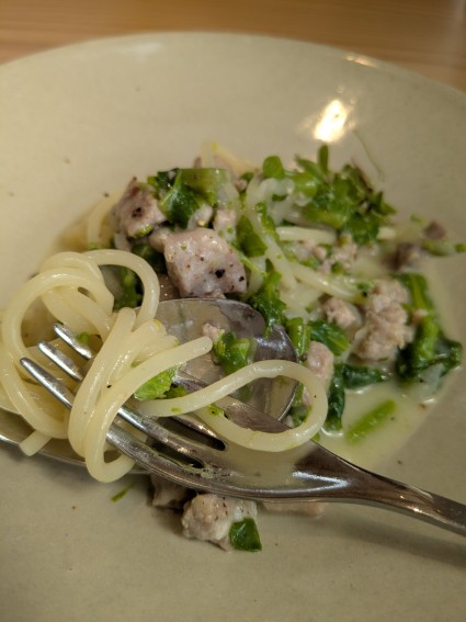 パスタは奥出雲ポークと菜の花のオイルパスタ